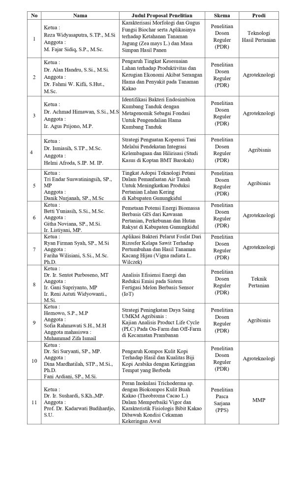 Lembaga Penelitian dan Pengabdian Kepada Masyarakat dengan ini mengumumkan Hasil Penilaian dan seleksi Usulan Penelitian Internal th 2025. Berikut daftar calon tim peneliti dan judul penelitian yang akan mendapatkan bantuan dana penelitian dari anggaran dana Penelitian Internal Instiper tahun anggaran 2025.